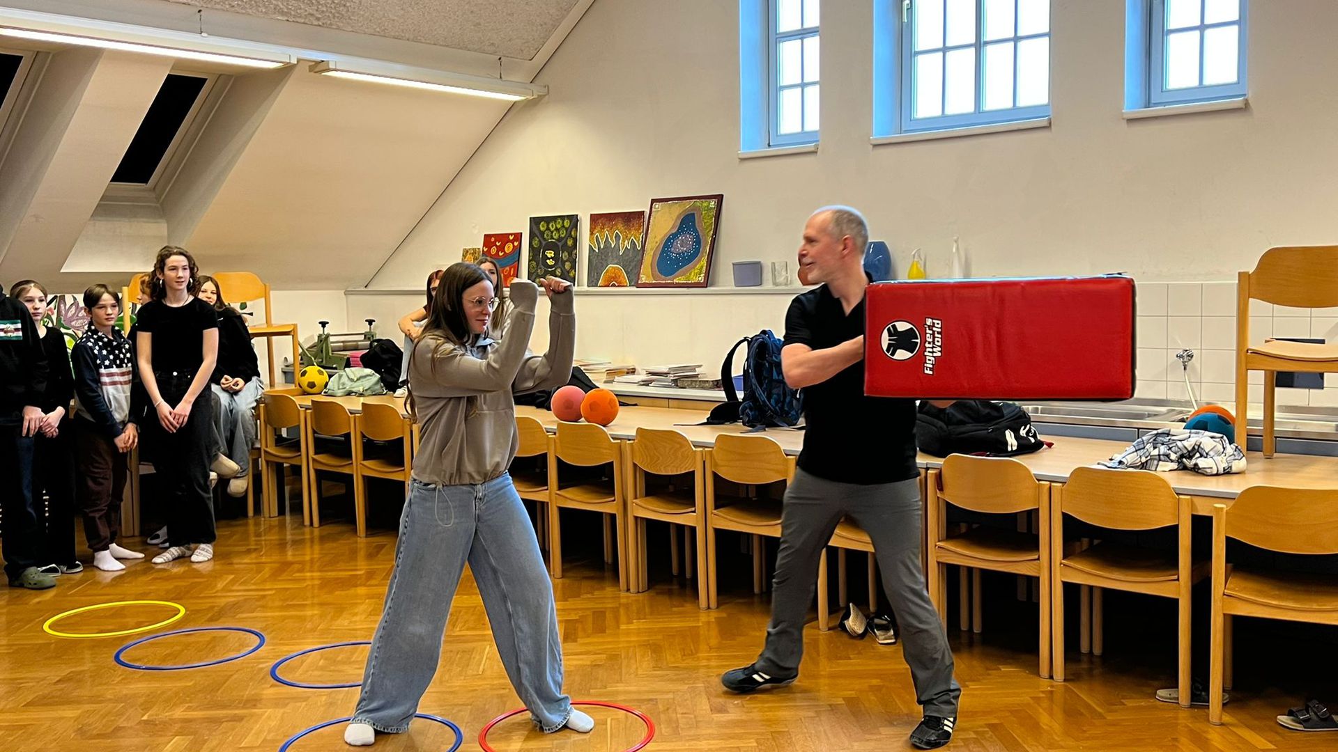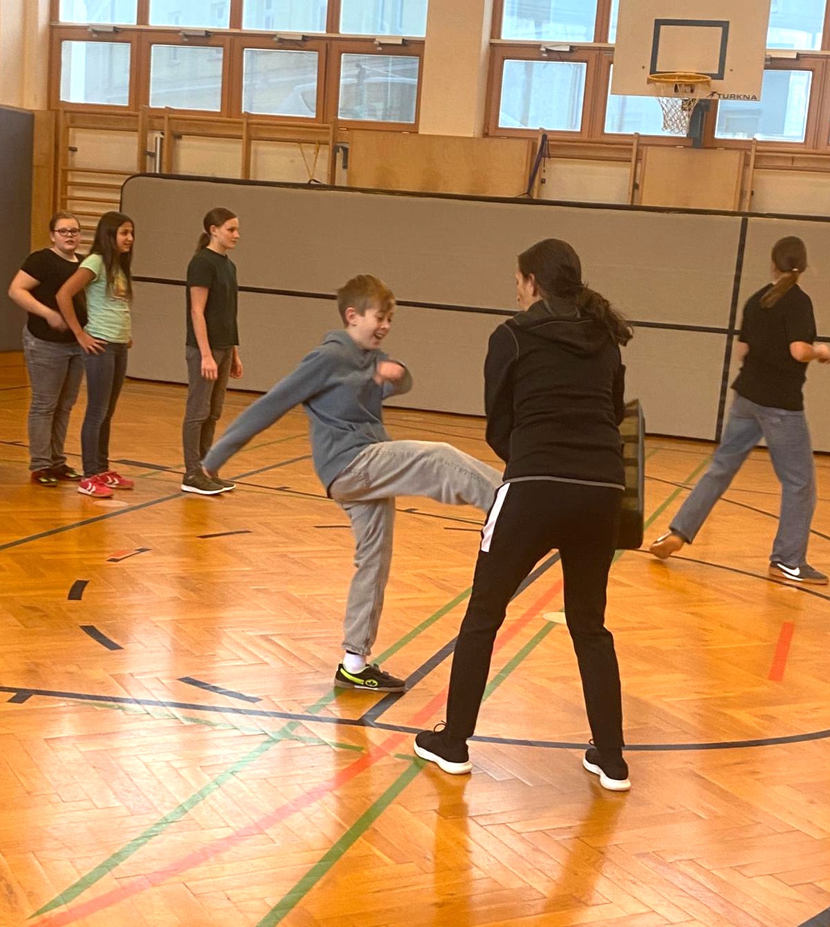 Der Kurs vermittelte den Schüler*innen wichtige Grundlagen der Selbstbehauptung: klare Körpersprache, deutliche Kommunikation und Strategien, um unangenehme oder bedrohliche Situationen frühzeitig zu erkennen und zu entschärfen. Ergänzend dazu lernten die Kinder einfache, aber wirkungsvolle Selbstverteidigungstechniken, die speziell für ihr Alter geeignet sind.